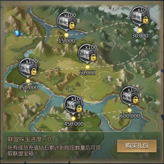 1、联盟成员购买礼包获得钻石时,将会增加该联盟的探宝进度。