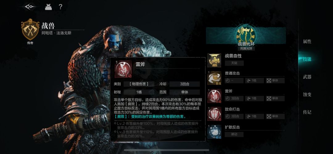 战兽光环,给全队兽人加反甲,最高叠到50%,第五回合后全队兽人反击比暴击