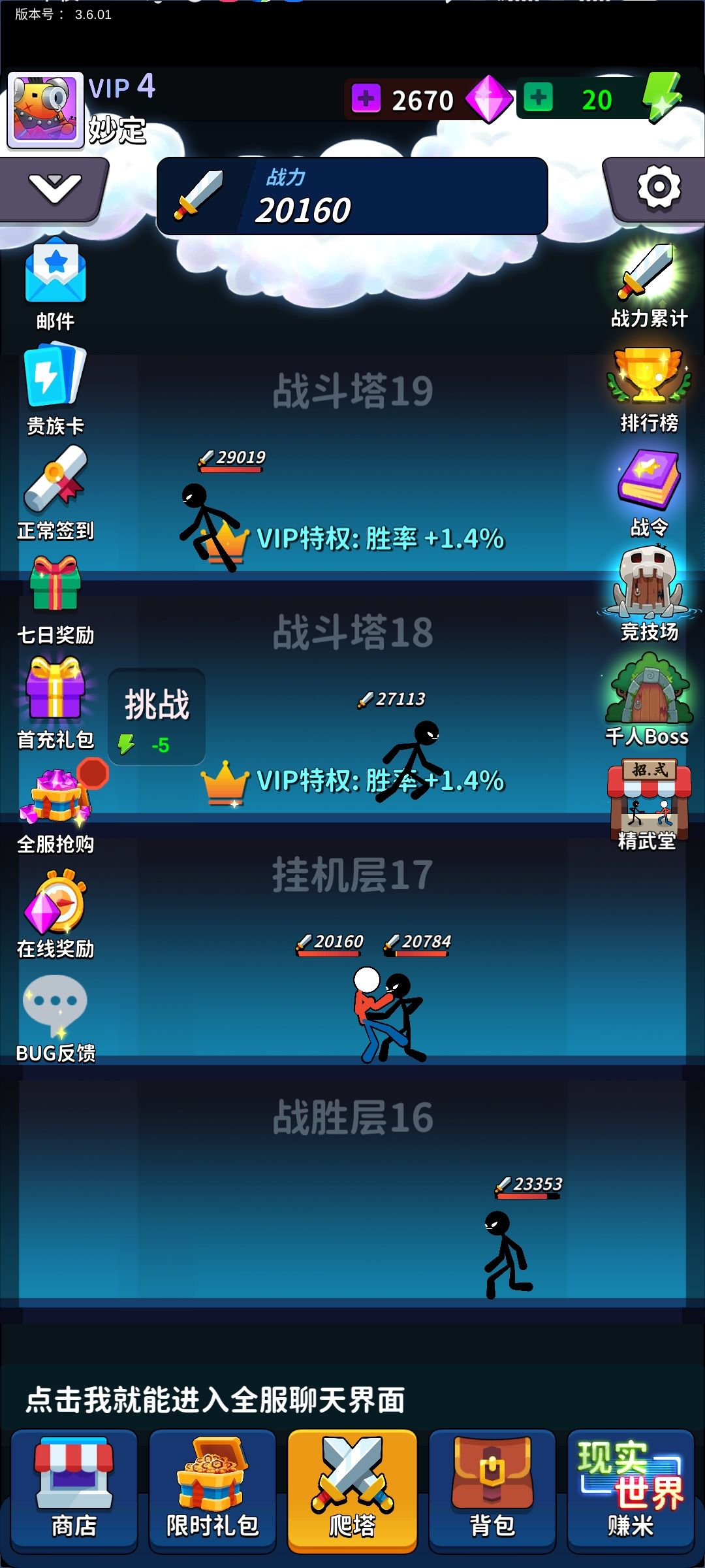 中间的爬塔是游戏资源链的最终归宿,在这个简单的游戏里,没有复杂的血量,攻击,防御,暴击,格挡,战力是衡量战斗水平的唯一决定因素,如果你的战力比怪高,必胜,如果战力比怪低,那么随着战力差距拉大,胜率会逐渐下滑,直至怪的战力是你的1.5倍,这时几乎没有希望能赢了,打普通的怪每次消耗5体力,如果是5的倍数层,也就是boss层,每次会消耗10或15体力,如果体力归零,就需要进食食物或者看广告以恢复体力。除了爬塔,组团打boss和打竞技场也要战力,对于竞技场,强烈建议战力比怪高再打,否则极有可能输,其次,你的VIP等级与在画面右侧中间“精武堂”中学会的招式,也可以提升胜率,但切记,战力是一切之本,不能舍本逐末。