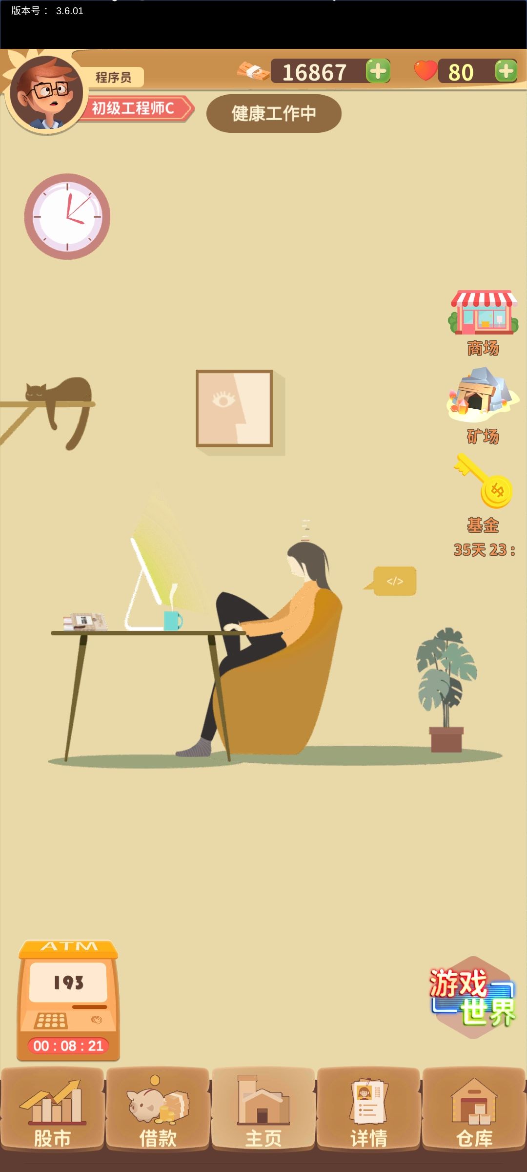 现实世界中,拿到钞票的方式是你的工资,以及各种各样的券和箱子,工资每30秒结算一次,可以在左下方的ATM机中随时领取,想要快速拿到钞票怎么办呢?你可以点击左上角人物的职级,如,上图中的初级工程师C,再点击之后出现的加速升职就可以加班,加班会立即获得大约当前薪资水准一小时的工资,还可以加速升职的进度,但是有一点,大学生的工资是随着职级上升而下降的,加班需要消耗健康,其中如果你的健康值在80及以上,那么你的工作效率为100%,健康低于80时工作效率会下降,到健康20时,工作效率为0,你永远没工资可拿,因此在任何时候,除非马上要嗑药,请保证你的健康值在80,健康值不会在任何时候自动恢复,恢复健康值唯一的方式是药店买药。点击游戏右上方的健康值加号可以进入药店,在你健康低于80时,界面右侧会出现救护车也能让你进入药店。