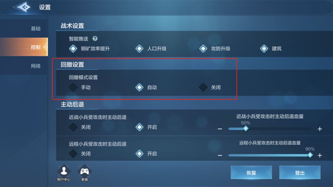 首先不是很推荐新手关闭自动回撤。起先我是回撤血量设置比较高,然后靠一个个手动点残血单位回撤的,后来发现后期部队数量上去了来不及点了。还是老老实实打开自动回撤吧。