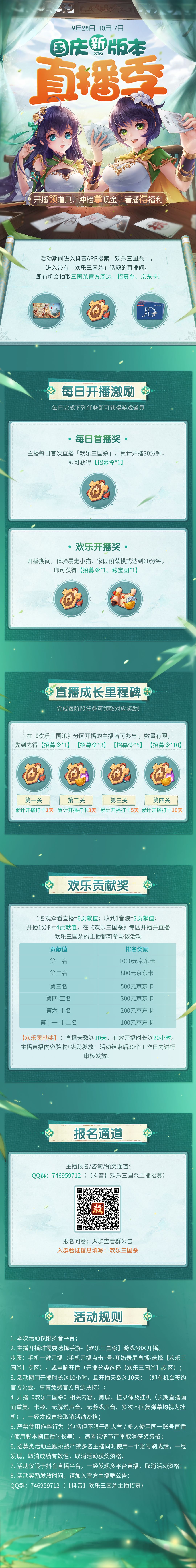 铛铛铛~~为了喜迎版本更新,欢欢诚邀各位主公来抖音直播和大家分享你的运筹帷幄、决胜千里!即日起参与抖音《欢乐三国杀》国庆新版本主播招募活动,招募令,京东卡等超多奖励等你来哦~