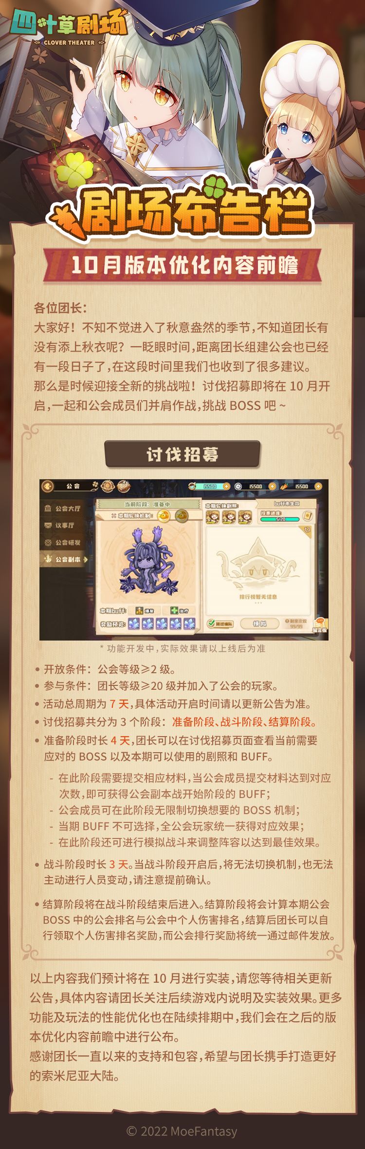 那么是时候迎接全新的挑战啦!讨伐招募即将在10月开启,一起和公会成员们并肩作战,挑战BOSS吧~