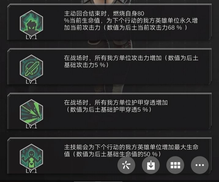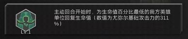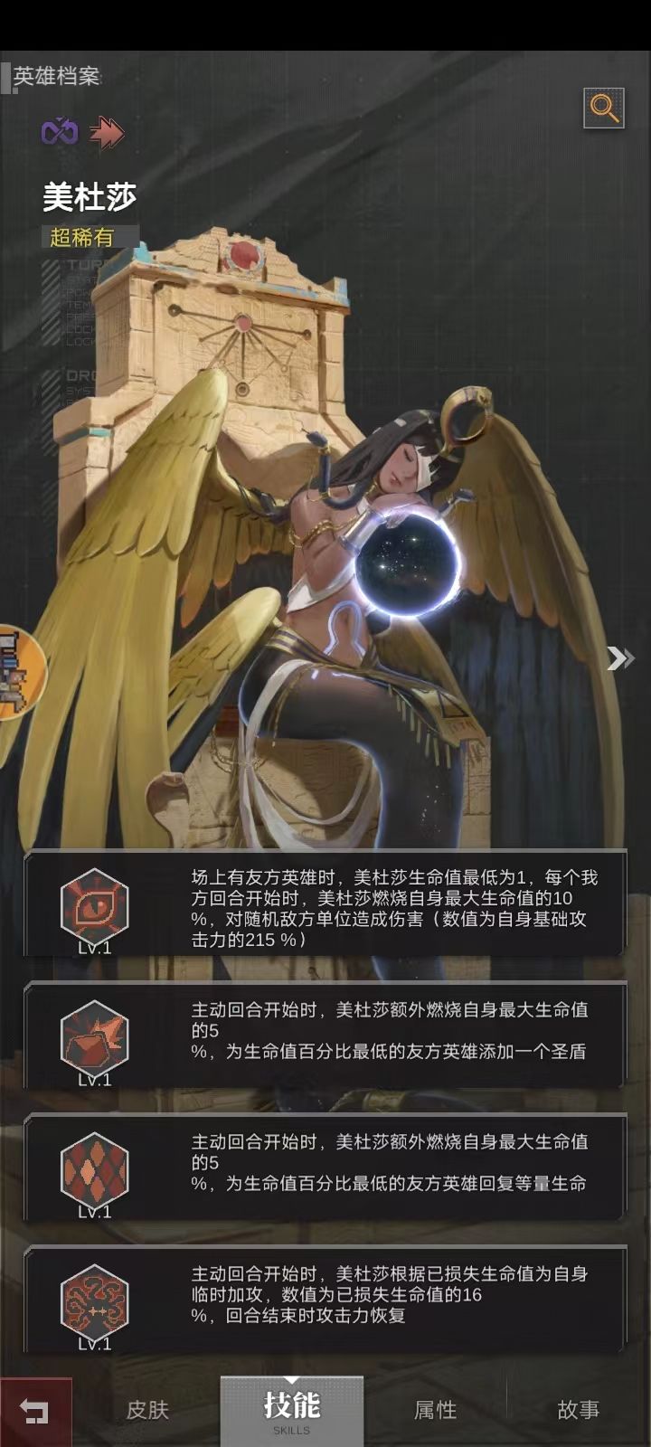 技能分析:1技能场上有队友时美杜莎就不会死亡,且每次我方回合开始时都会随机攻击一名对手( 伤害值固定基础攻击力215%,不会增加);2、3技能都是辅助类技能:(美杜莎回合)燃血给百分比血量最低的友方加盾、回血(燃血量), 对美杜莎自身不生效;4技能根据已损失血量临时加攻,回合结束恢复4技能 生效前的攻击力,因此总血量/回血量越高,可损失值越高,自身回合加成越高。