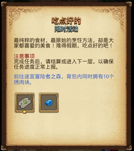 欢庆庆典除了玩,那当然就是吃了难得的假期放纵自己海吃一顿前往冒险者之森背包内同时拥有10个烤肉块(你怎么知道放牛最喜欢吃烤肉?)