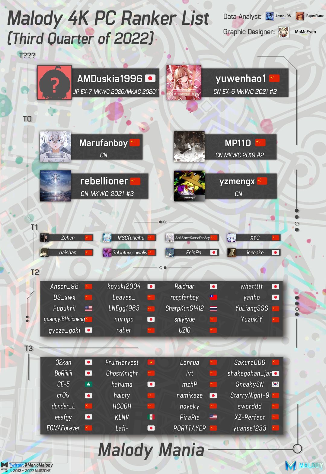 是2022年第三季度的4K Ranker表,Staff们参考Stable 25-35的E判Acc判定分成多个梯队制作而成,如今有了许多新面孔,期待下次的变动
