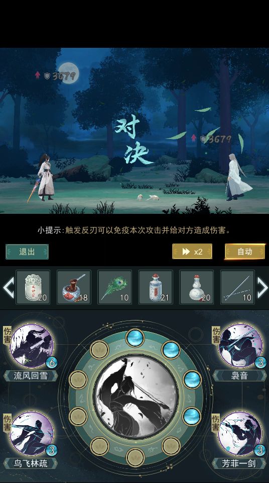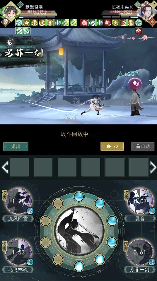 这个轴会综合一些,对轻剑门派也更有优势,毕竟都刮嘛,但对面刮得肯定没有花语蝶2回合连回血带盾回20%总生命来的快。面对重剑的话,表现应该也行。要是想更加克制一点的话,首发花语蝶换成鸟飞即可。