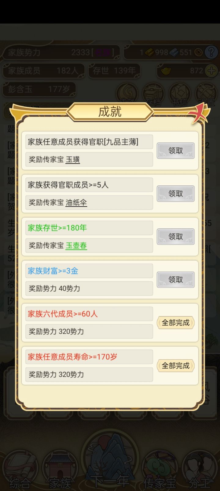 第一次玩到1300多年,成就完成了,发现没有继承人。第二次又玩到178岁,儿孙都活着,结果更新了。我太难了,早知道更新以后再玩简单点!