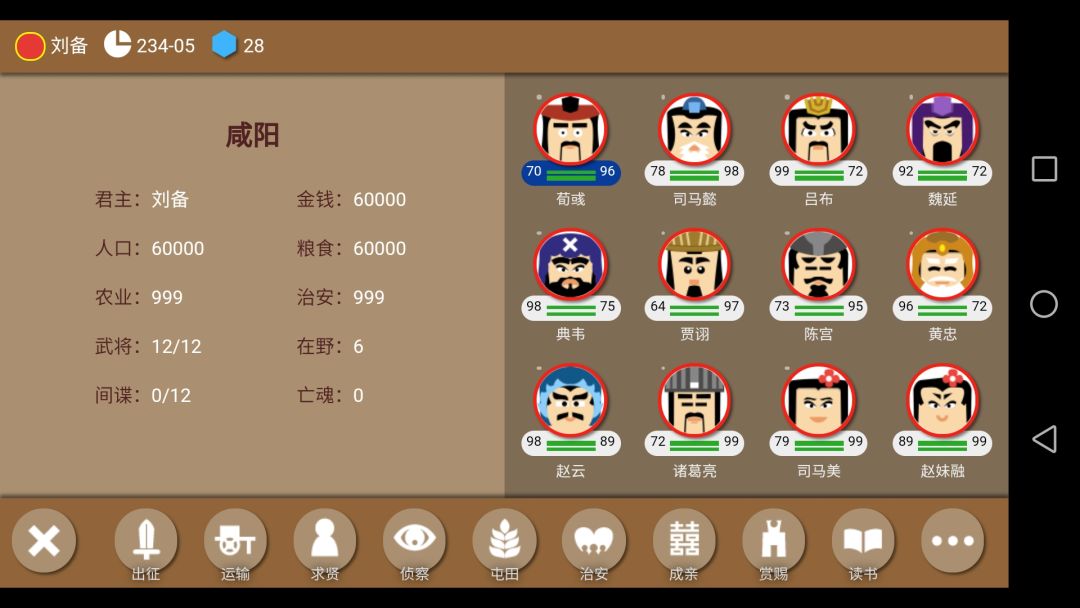 7. 可以招一些低属性武将,投降完了再逼降回来,然后治疗再征兵,重复使用。
