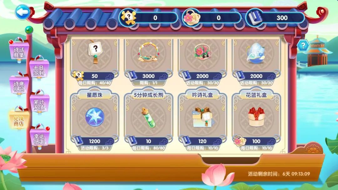 填写成功的诗句提交后兑换得到的诗集道具奖励这时便可以前往兑换商店进行兑换丰厚奖品!国庆限定头像框、庆典花篮鱼、茶具鱼蛋、星愿珠等道具都在此上架,抓紧努力填写古诗兑换奖励呀~