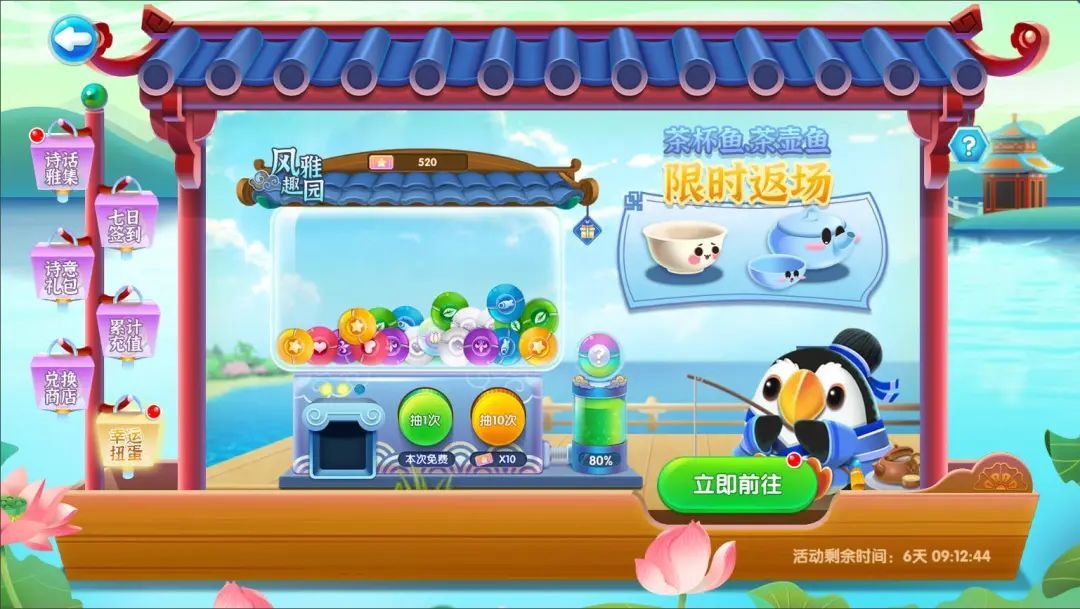 企鹅老板换上新装带上限时返场的茶杯鱼、茶壶鱼也来凑热闹,国庆活动专属扭蛋机已开启,快把茶杯鱼、茶壶鱼扭回鱼缸泡一壶好茶~