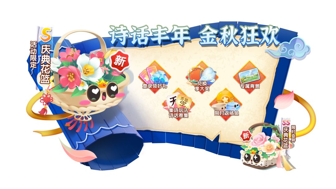 诗话丰年这诗意礼包当然不会少,礼包中贴心准备了庆典花篮、万能字、诗集道具、钻石等好礼,活动新鱼直接带回与馆长共贺国庆~