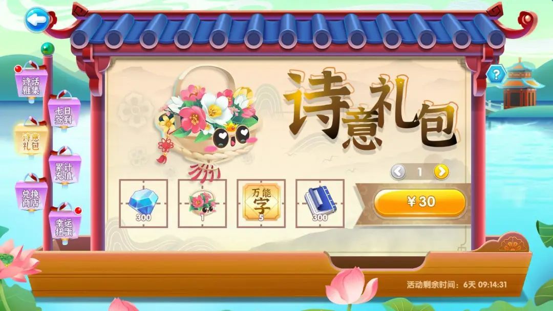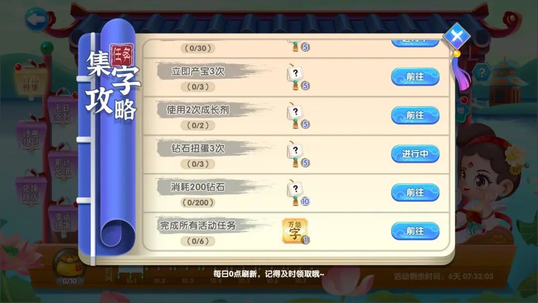 万能字:①诗意礼包获取;②累计充值获取;③完成【集字攻略】所有活动任务获取;