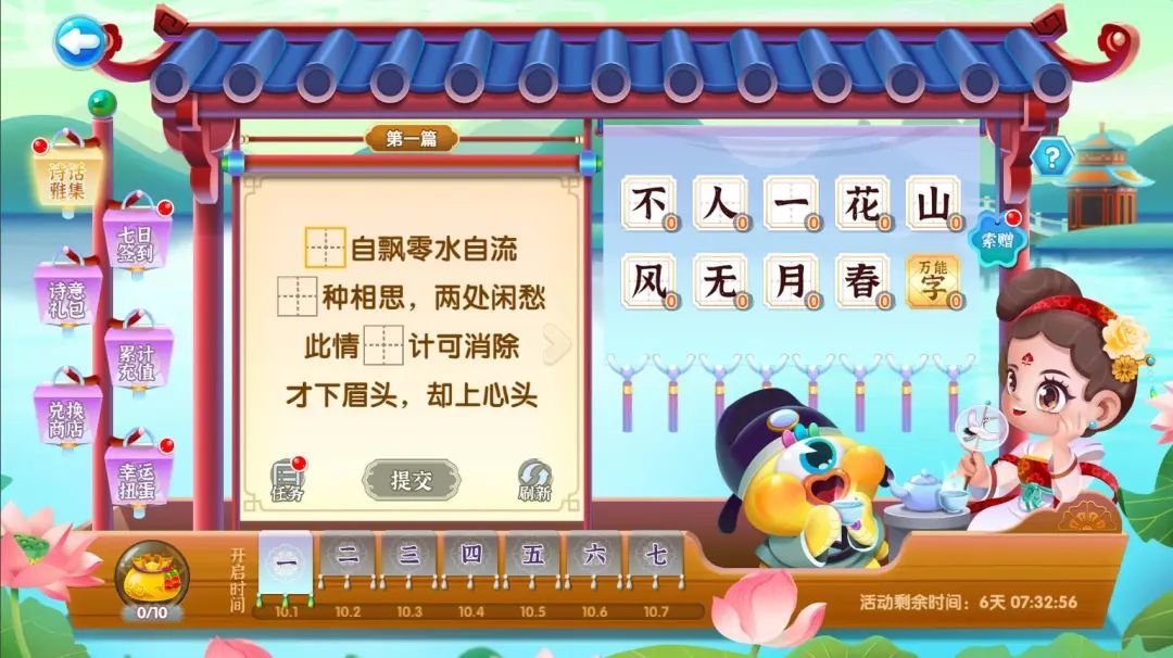 活动期间馆长每天可以随机刷出20首诗,填写古诗提交可以获得【诗集】奖励,馆长也可以刷新获得新诗句,每集齐10首诗还有专属礼袋可以领取哟~