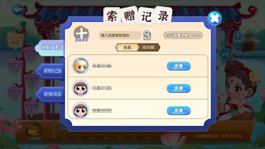 随机字:①鱼池收宝有概率随机获取一个诗字碎片,每日收宝获取无上限;②每日10次机会向好友或鱼乐圈成员索要;③兑换商店获取④完成【集字攻略】活动任务获取;