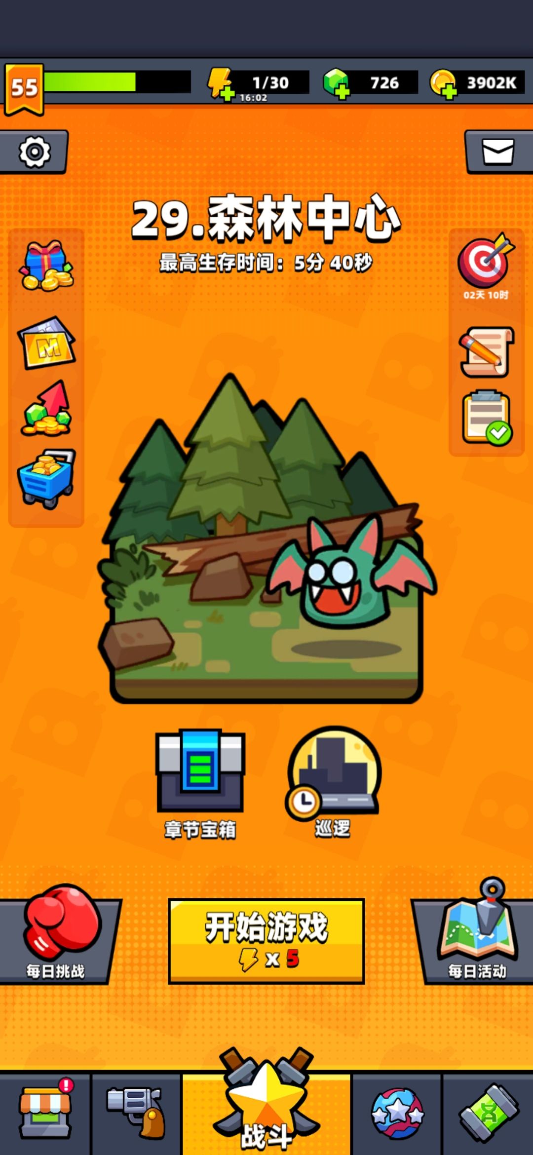 4、这里讲推图吧,推图如果推不动的话,就打打挑战,毕竟挑战不费体力,随便打,两个都打不动的话,建议挑前几关打,刷刷钱,刷刷装备,推图的武器推荐,最理想的推荐是,苦无,足球,榴莲,火箭,转轮和立场,把榴莲和火箭,换成闪电和激光都行,选这两个的目的是为了空出来一个位置,再选一个强力弹头补伤害,说一下用途,首先苦无肯定是打boss,前期清怪,足球也是为了打boss,足球弹boss还是比较疼的,榴莲和火箭其实就是为了放大,在后期来包围圈的时候配合轮子和立场,可以有足够的空间去溜着打精英怪,如果是闪电和激光的话,就稍微困难些,目前本人推图用的是那一套,没出也不用太刻意去凑,一个火箭换板砖也行,足球建议是必须有,没有足球打boss太痛苦了,速度很慢,至于哨箭虽然带跟踪,但是打boss还是搓泥的伤害,还有火本人不太爱用火和激光,这两个后期打boss容易看不清boss的轨迹,还有的子弹轨迹,这里再废话一些,说一些小细节,如果包围圈来了,你发现打的很困难,想办法冲出去,但不能跑太快,慢慢跑,这样一群怪会跟着你屁股后面走,跑太快又会被包住,这个打法个人主页有过20关的视频,大家有兴趣了可以看看,还有就是看到炸弹要控制住别捡,不然怪炸没了又陷入包围圈了,还有一点也算是本人的小技巧,进图优先把一个弄成超武,类似于苦无,足球,轮子这些,打完第一个精英怪感觉运气好,点了好几个苦无了,箱子先别捡,等凑好了再捡会第一时间获得超武,本人一般都会留一个箱子,不然好不容易凑齐了发现没箱子,然后又脸黑好几次升级都不给超武,容易G