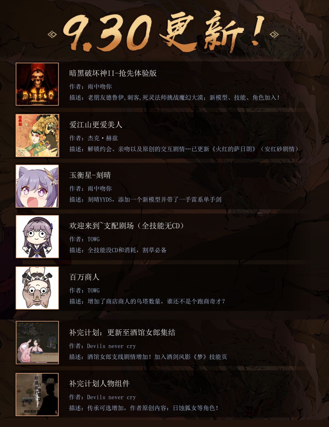 这一次有7个模组会被搬运到手机端中,他们分别是:百万商人、暗黑破坏神II-抢先体验版、玉衡星-刻晴、补完计划人物组件、补完计划:更新至酒馆女郎集结、欢迎来到~支配剧场(全技能无CD)、爱江山更爱美人。