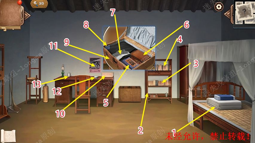房间:1.整齐的床铺、2.简陋的书架、3.《南华县志》、4.《明史纪事本末》、5.《民俗学集销》、6.小药箱、7.换洗衣物、8.黑色药丸、9.一只藤箱、10.一叠作业本、11.电影海报、12.空碗、13.白瓷茶杯。7