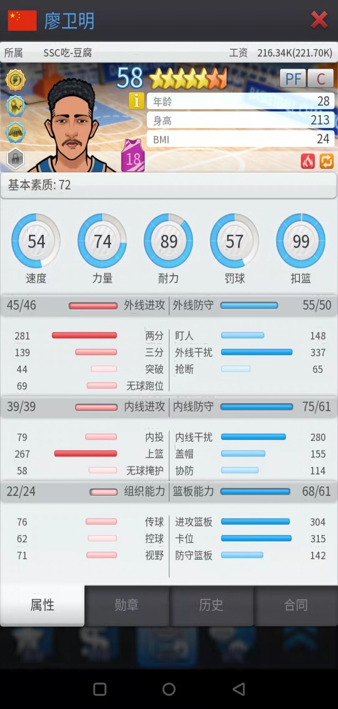 点评:力量简单粗暴,对于需要低位单打与低位防守的内线而言,力量的重要性是决定性的,非常关键,不可或缺。70的力量基本是所有有低位需求的内线的合格线。