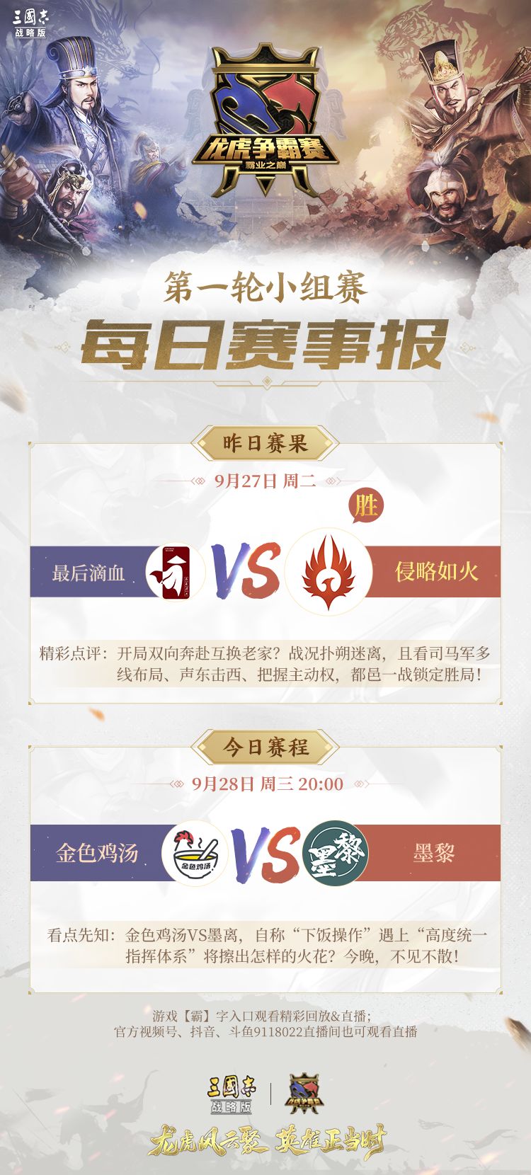 今晚8点,游戏【霸】字入口、官方视频号一起观看精彩直播!斗鱼直播间(房间号9118022)抖音搜索“三国志战略版”也可观赛!