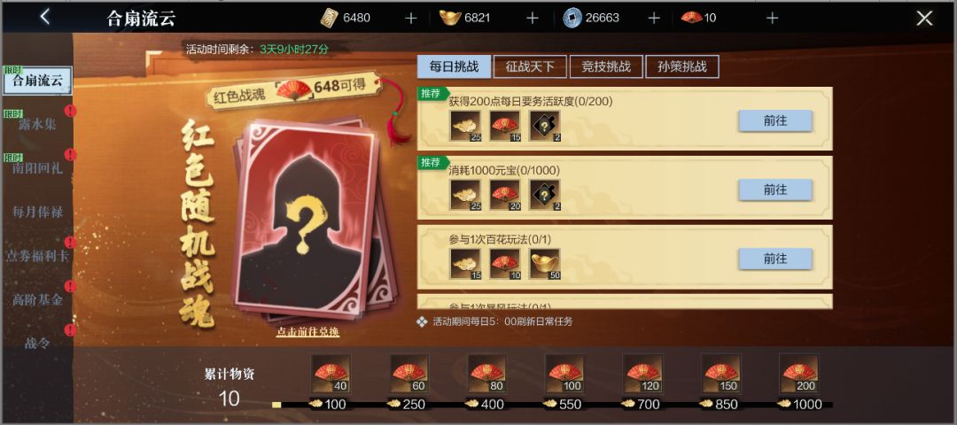 完成限时军务获得折扇,可在「流云集市」中兑换红色随机战魂、精致无双令等奖励。