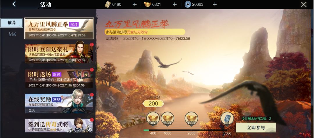 参与活动接取银杏叶获得积分,累计积分可获得元宝与无双令。