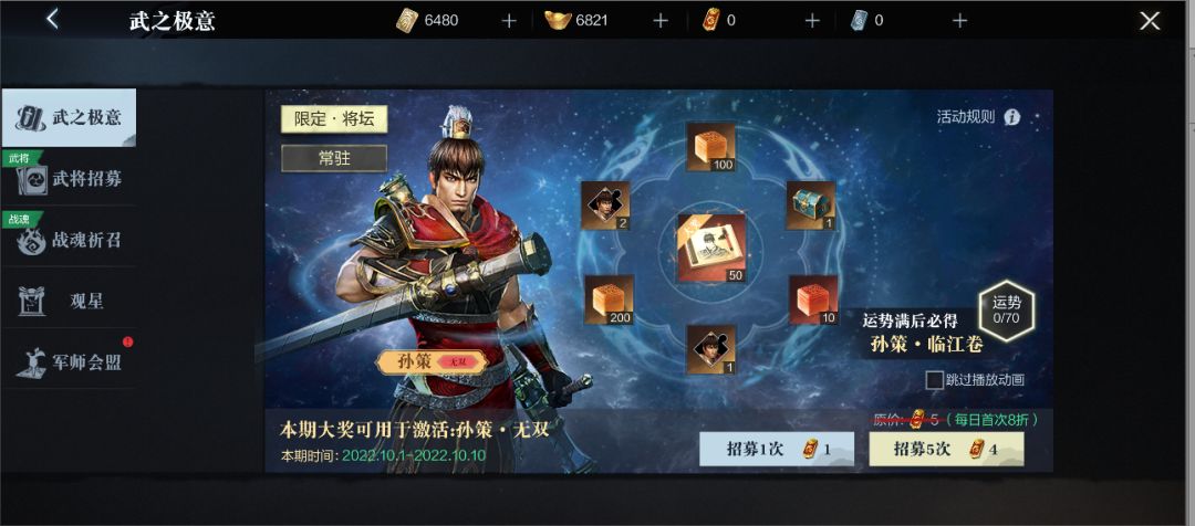 1. 无双孙策招募开启时间:10月1日5:00-10月10日23:59;