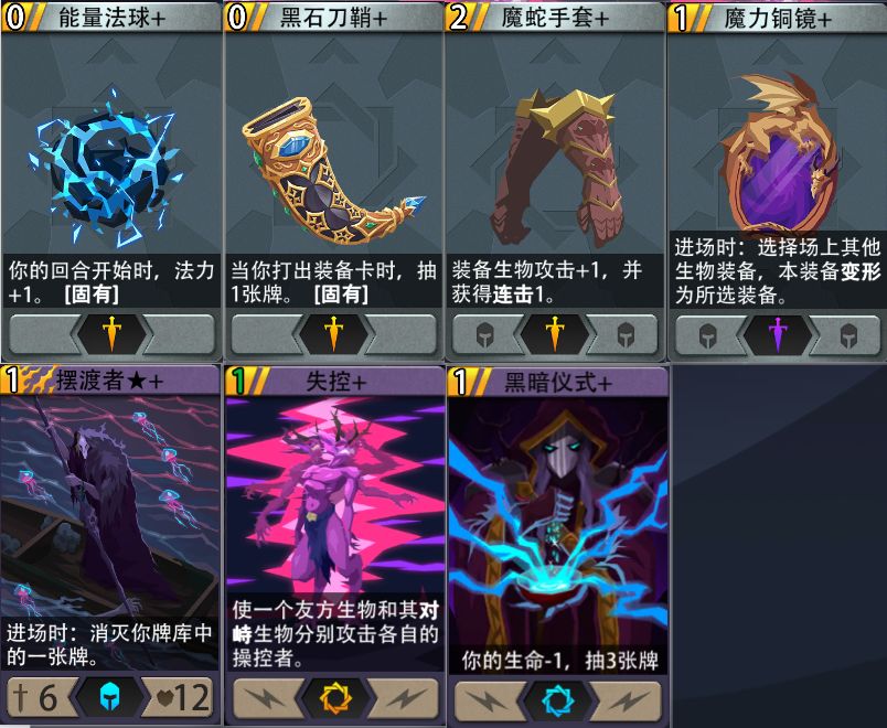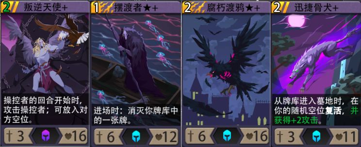 2、梦魇:梦魇前期依然可以使用天使过渡,后期卡牌升星则建议更换攻击力更高的摆渡者,还可以配合骨犬,渡鸦的身板也不错。