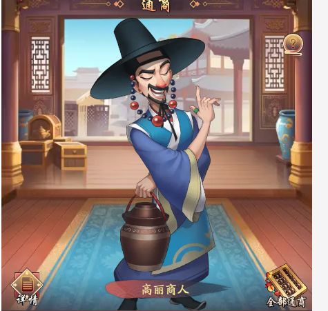 3.高丽商人高丽商人是我们解锁的第三个商人,一次通商花费25个亿,我们能获得500万阅历和少量门客培养材料。
