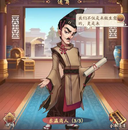 首先通商是一个极其耗费银两的玩法,我并不建议前期去通商,虽然他可以获得不少好东西,还有阅历,但是前期发展和快速通关更重要,并且通商的商人就是通过过关数来解锁的,个人建议赚速没到40万就少通商,注重发展。接下来我们来说一下应该和谁通商利益最大化。