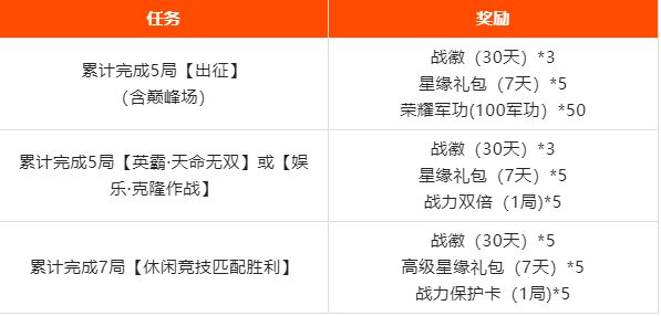 累计在线5分钟可获得马腾*鸢鸟长空体验(1天)*1、军团秘境挑战令*1、星缘礼包*5、兵粮卡*2。