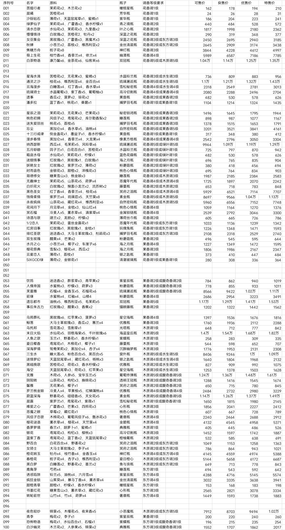 香水配方及各级售价,按图鉴顺序排列(持续更新中...)