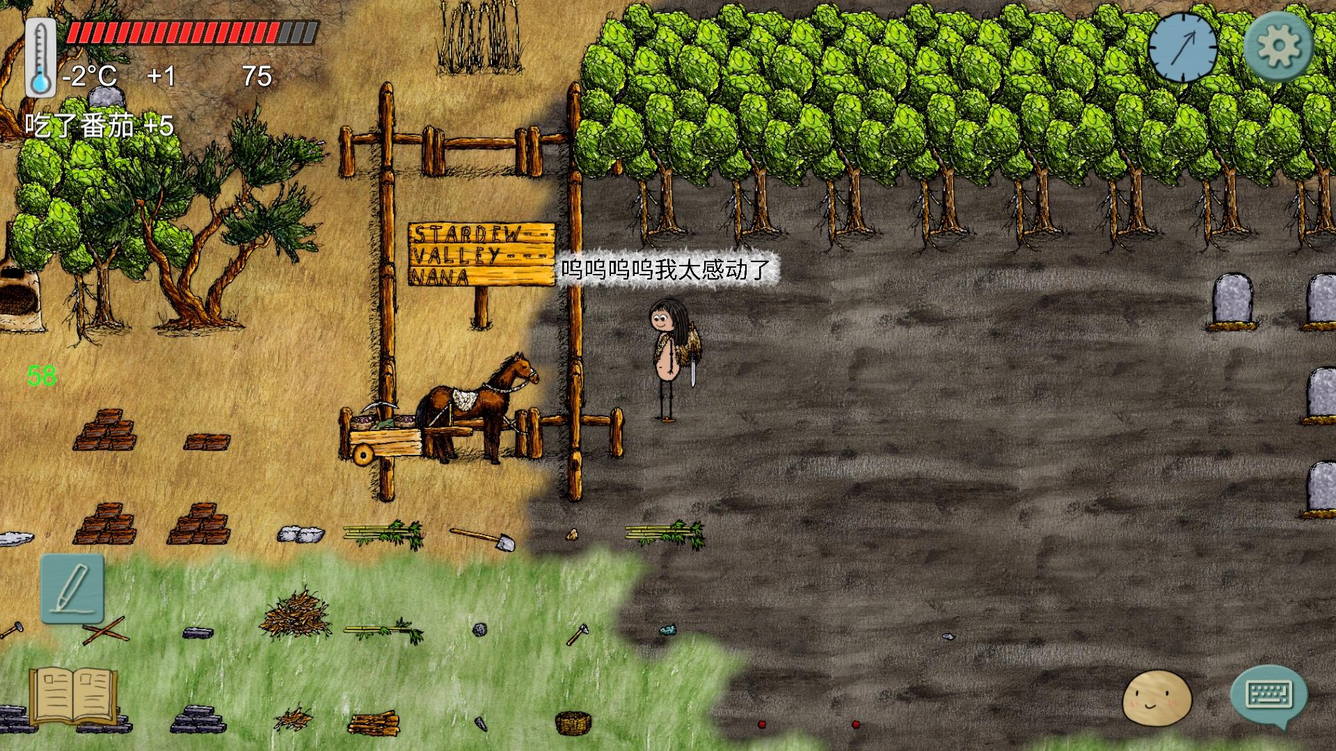 很快我找到一个村落,但不是我家呜呜呜(没截图)。家里一个人都没有,村落处于石器时代,种的胡萝卜苗还没长成,我想女娲可能还活着。我停下马车,在她家等她回来。等待过程中我很纠结,传四人少,难得遇见野生室友,可是要我放弃自己的家又很舍不得,毕竟我也不算断档啊,我家一直都在某个地方等我回来。最终我放弃了野生室友,再次踏上孤独的寻家路(此处应该响起回家的诱惑BGM)
