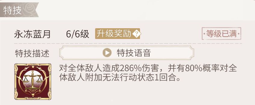 特技倍率较高,自身残血时增伤,数值很高。但是目前你游环境,日常不会战至残血,高难则是容易被秒;就算你能卡到30%血以下,此时也未必SP正好攒满,攒满前大概率已出局,所以此增伤极难触发。更何况残血增伤还有个爆发天花板红月,此卡与之差距甚大。自身残血效果的血线在50%以上才容易触发。