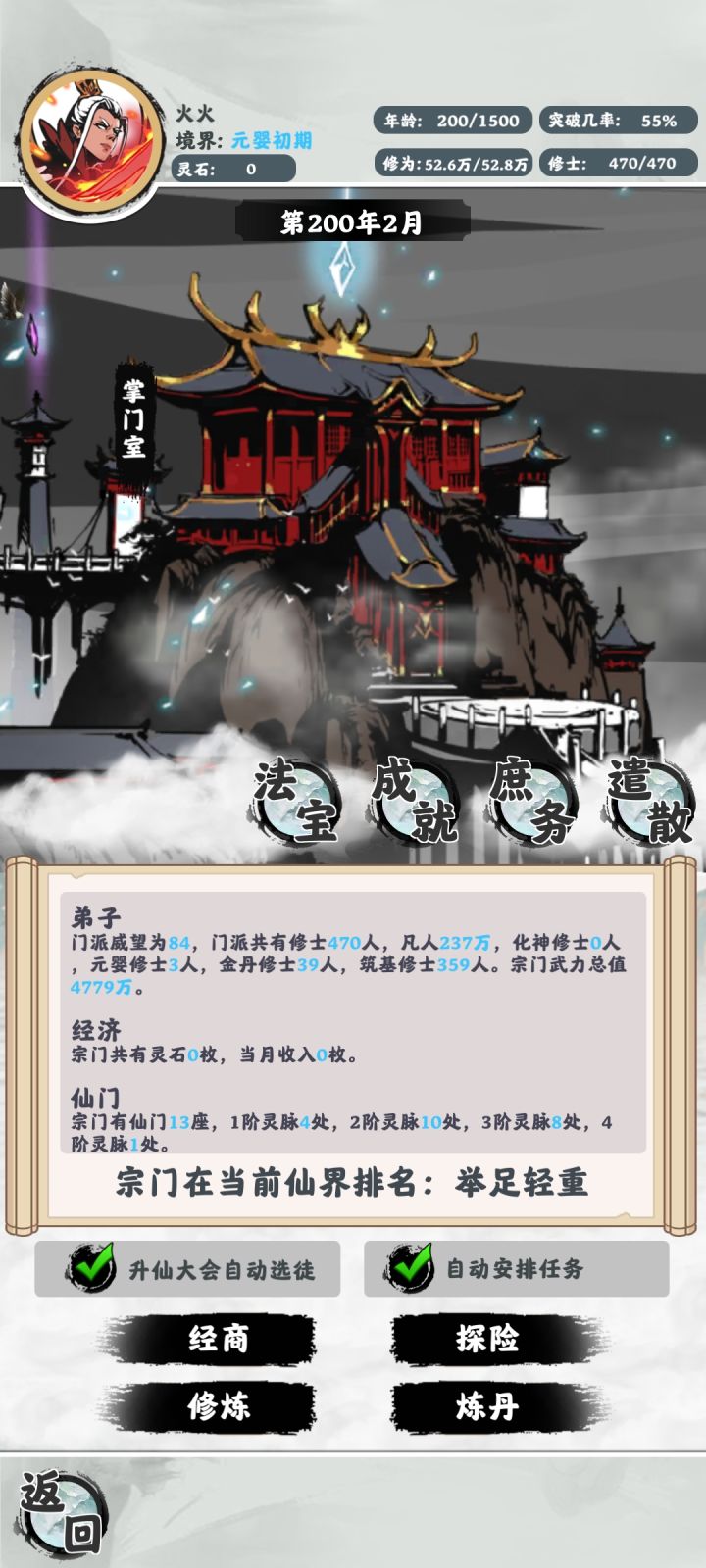 1.图一为赚钱修炼流,即庶务自动派遣入门弟子修炼,将金丹及以上(缺钱可以放筑基)经商赚钱,两百年得到291金丹弟子