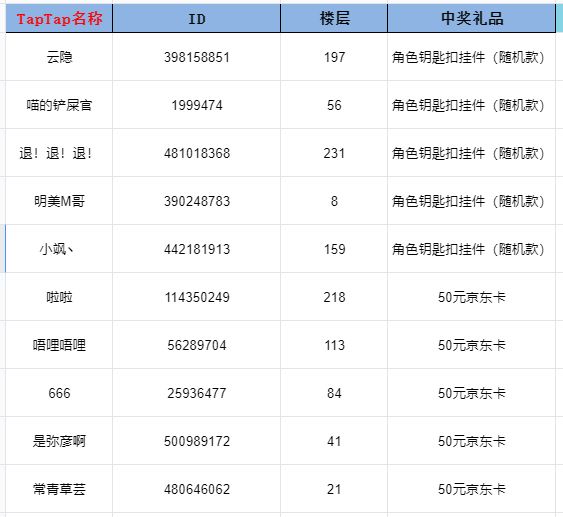 以下为《卡牌迷境》中秋节预约祝福活动TapTap中奖名单: