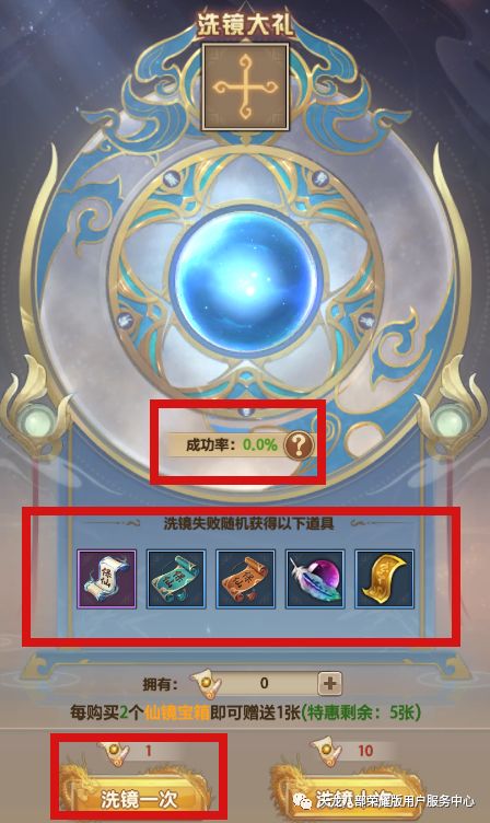 利用洗镜符在活动页面进行抽奖,一张符抽取一次,也可用十张进行抽取。若一发入魂“洗镜大礼”!则7星保仙符到手!可再次选择“洗镜大礼”进入奖池;若未抽中“洗镜大礼”,奖池中还有“4星保仙符、3星保仙符、2星保仙符、凤翎还灵丹、合镜符·灵”诸多奖励掉落,并且会增加下次抽中的“成功率”。注:选择不同星级的保仙符,每次洗镜增加的概率不同,各位少侠量力而行哦~↓活动页面↓