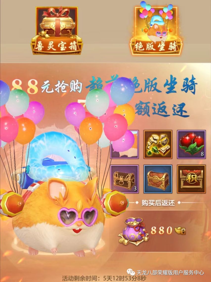 活动期间,少侠可以在该页面购买兽灵宝箱(1元)和绝版坐骑(88元)。购买七天后将返还对应宝箱的等额绑元数。