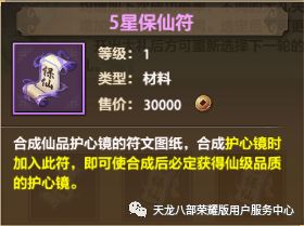 注意:合成过程中若未使用“保仙符”,则“仙”品的镜子大概率会降低品级!降低品级属性则会随机减少!而使用“保仙符”则能大大提升概率合成“仙”品的护心镜。