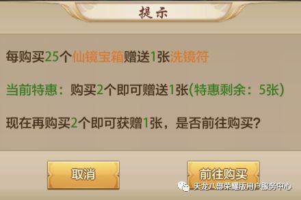 活动期间,少侠购买仙镜宝箱可获赠洗镜符。首次获赠洗镜符购买宝箱时最为优惠,购入2个宝箱即可赠送一张!后续优惠将持续衰减,直至购入25个仙镜宝箱才能获得一张洗镜符。