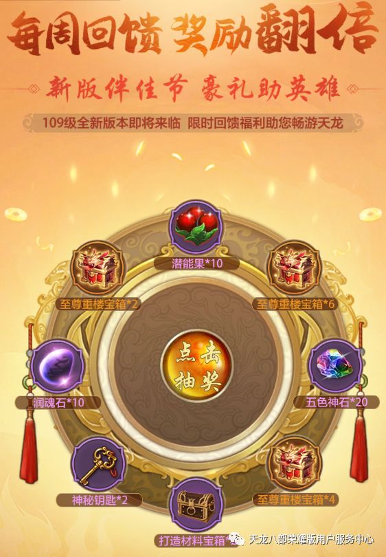 活动入口:精彩活动→感恩回馈→点击抽奖本次感恩回馈不同与往!奖池中“至尊重楼宝箱”奖励从以往的1、2、3个,直接翻倍为2、4、6个!特大福利不容错过!