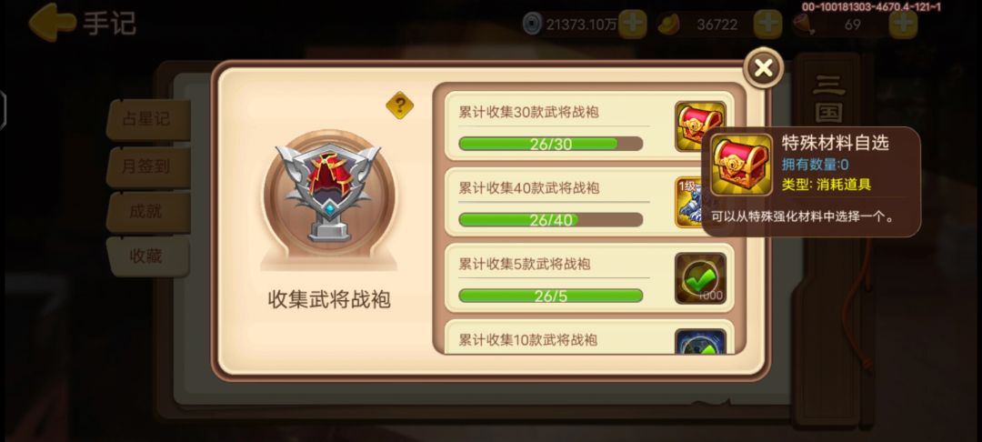 ②,『手记』当中通过『收藏』目前最多可以获得50个特殊材料(自选)