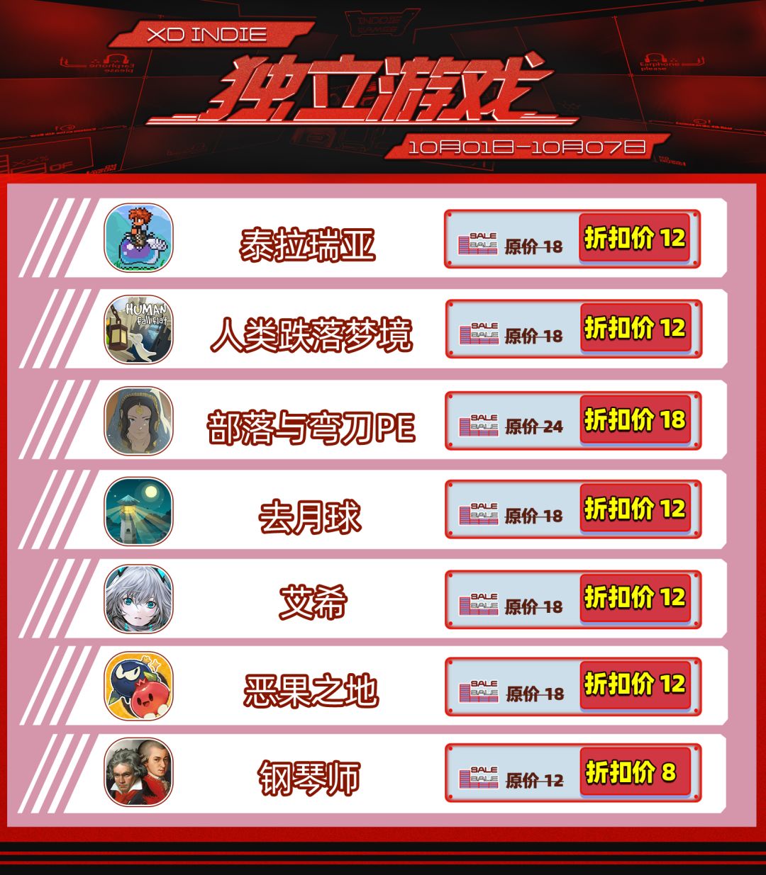 在10月1日-7日之间,《泰拉瑞亚》《人类跌落梦境》《部落与弯刀》《去月球》《钢琴师》《恶果之地》《艾希》将开启限时折扣。