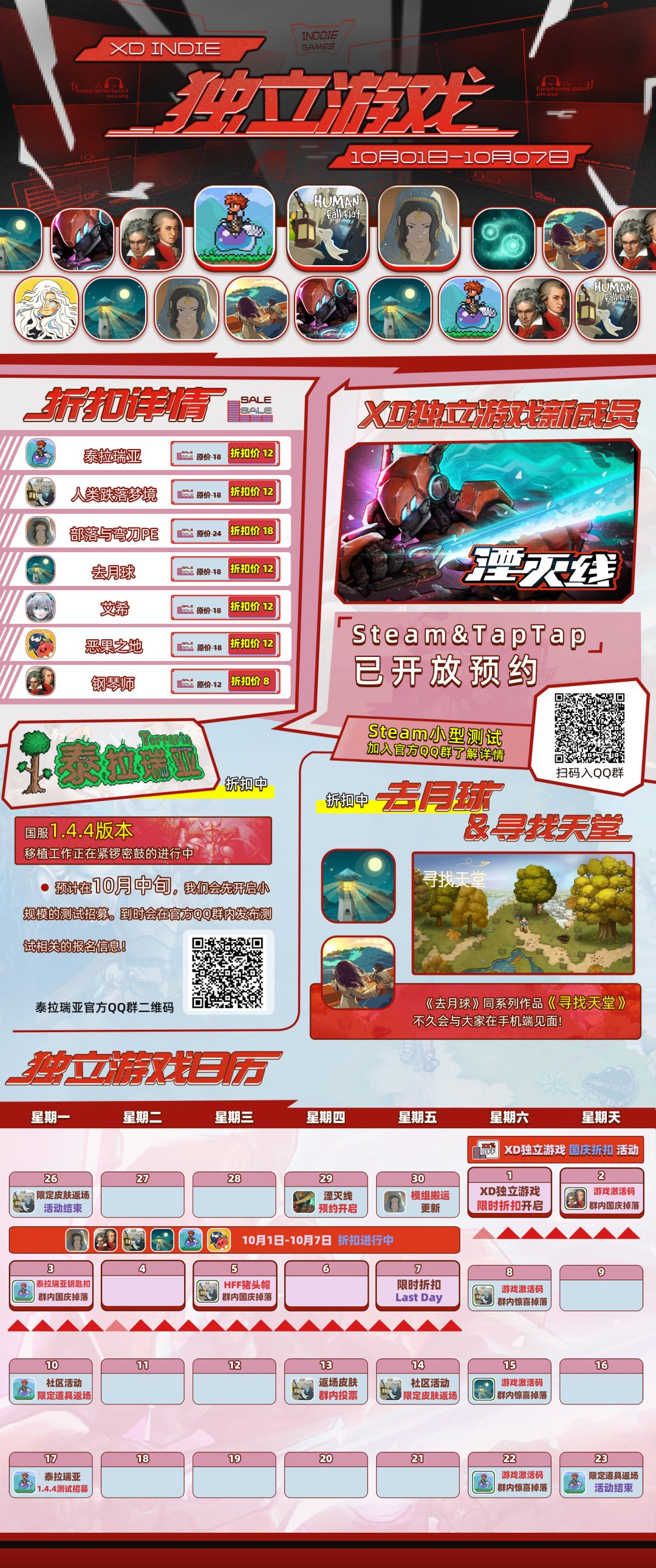 在此之后,《泰拉瑞亚》的1.4.4版本测试和更新,也会在10月到来。更多的折扣信息和活动细节我们给大家准备了省流一图: