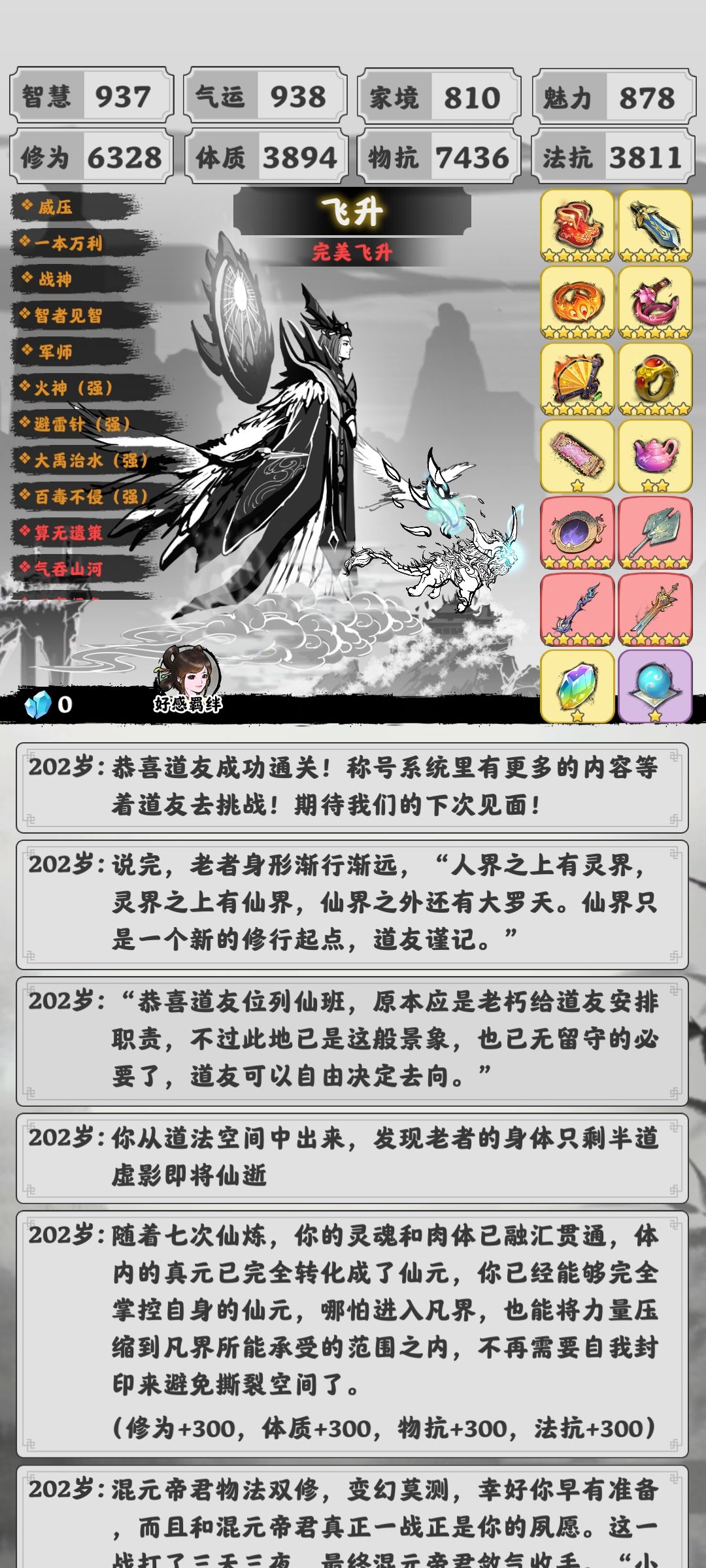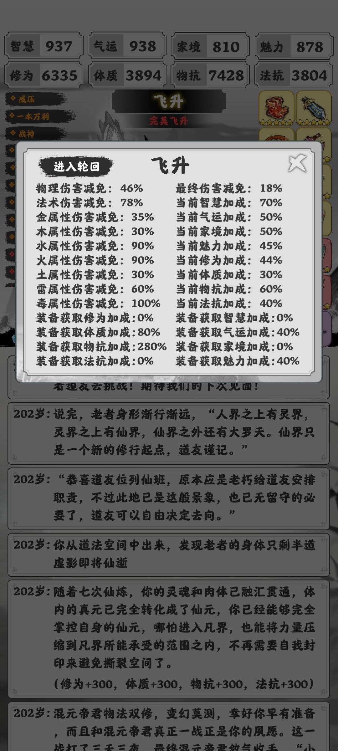 推荐玄溪暖暖完美飞升。加点是气运家境对半分。丹药的话一般是要吃3次家境丹就差不多到780了不够的话可以后期再补,智慧丹一般不用吃,宠物第一词条是气运词条一般可以吃一颗气运丹或者宠物二四词条有气运的话那一颗都不用吃,多余的吃丹药机会可以留给物抗和体质。但是物抗的收益比体质收益高很多。物抗的加成有也高于体质。物抗>体质>修为>法抗。另外就是从1岁开始到202岁结束有那种选择问选体质还是修为一概选体质。因为到最后差不多1体质抗伤等于1.8修为的抗伤约等于2法抗的抗伤而1物抗的抗伤等于1.15体质的抗伤。如图物抗加成是60%体质加成是30%。1物抗加成后就是1.6物抗,1体质加成后是1.3体质。如果四红都满了的话玄溪暖暖完美飞升也不缺修为因为修为有44%的加成也就是说只要你有2901-280*1.44=2497.8修为那么就铁定能飞升。
