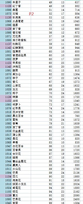 1. 【前四张图】是按照一朵成熟时间的升序排序!一朵成熟时间!一朵!!!便于选择时间最短的配方速刷香水品质【后四张是按照顺序编号】