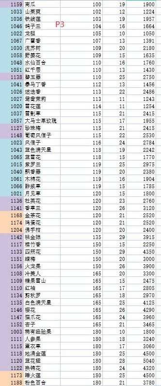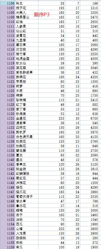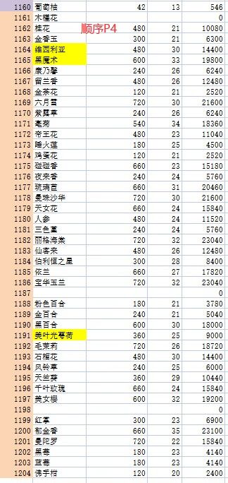 【时间管理带师】(已卸载)关于花朵成熟时间的表格,普通品种和稀有品种齐全,即编号1001-1160齐全。极品种子有两个未知
