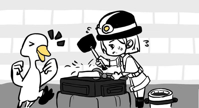 创作灵感:我觉得打铁现场金属互相敲击的“哐哐”声音特别解压,还很有趣,所以把这个画面记录了下来。而且打铁的时候大鹅都仿佛在我身边和我一起用力,为我加油,于是这次我把他画在了我身边。