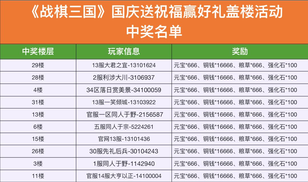 在本活动贴内留下对祖国的祝福语或国庆节对亲朋好友的祝福 ,亦或是国庆节对战棋三国的寄语等,并附上区服名称、游戏ID(一串数字,点击游戏内点左上角头像可查看),即可参与#国庆送祝福赢好礼盖楼活动#。在所有参与玩家中,随机抽取10位幸运玩家获得最终奖励。