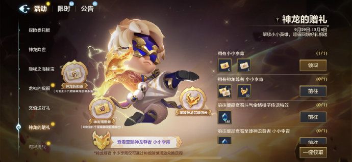 活动【神龙的赠礼】开启,拥有小小英雄【小小李青】、小小英雄【神龙尊者 小小李青】,以及完成活动任务,可获得对应的活动奖励!